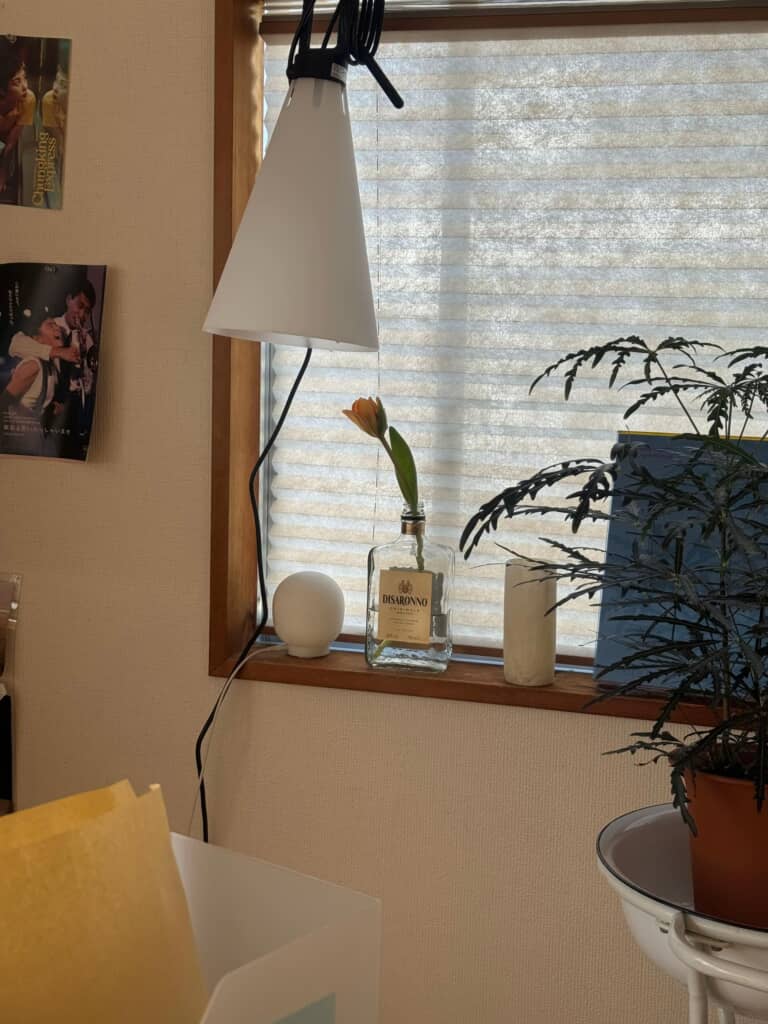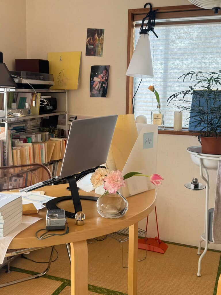 デスク周りやラックには本や紙ものなどがたくさん置かれていますが、全体の色味を抑えてすっきりとした雰囲気になっているからか、雑多な印象にならないのがセンスを感じさせます。花瓶や照明などのディティールにもこだわりが光り、どこか懐かしいノスタルジックさと現代的な感性が共存しているようです。