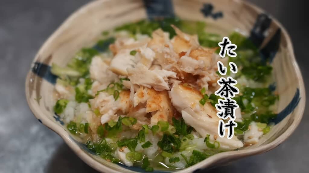 動画の後半では、真鯛の頭とカマの煮つけ、塩焼き、そして腹骨を使った「鯛茶漬け」の作り方を紹介。まずは鯛のアラを、少し焦げ目がつくまでしっかり焼きます。この焦げがうま味になるそうです。