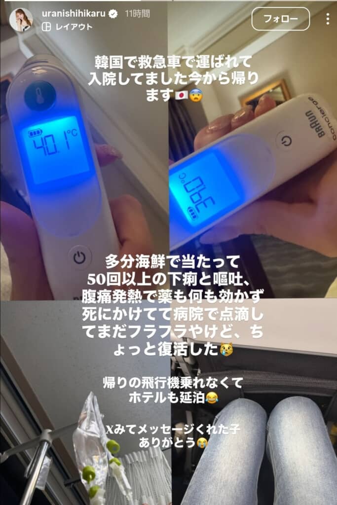 この日、投稿では「結局、韓国で救急車で運ばれました」と報告。40度の高熱や50回以上の下痢、嘔吐、腹痛に苦しみ、「1人きりでホテルで動けず1日耐えて、持ってた薬も効かず人生1の地獄だったので結果的にもっと早く呼ぶべきでした」と当時の状況を振り返りました。