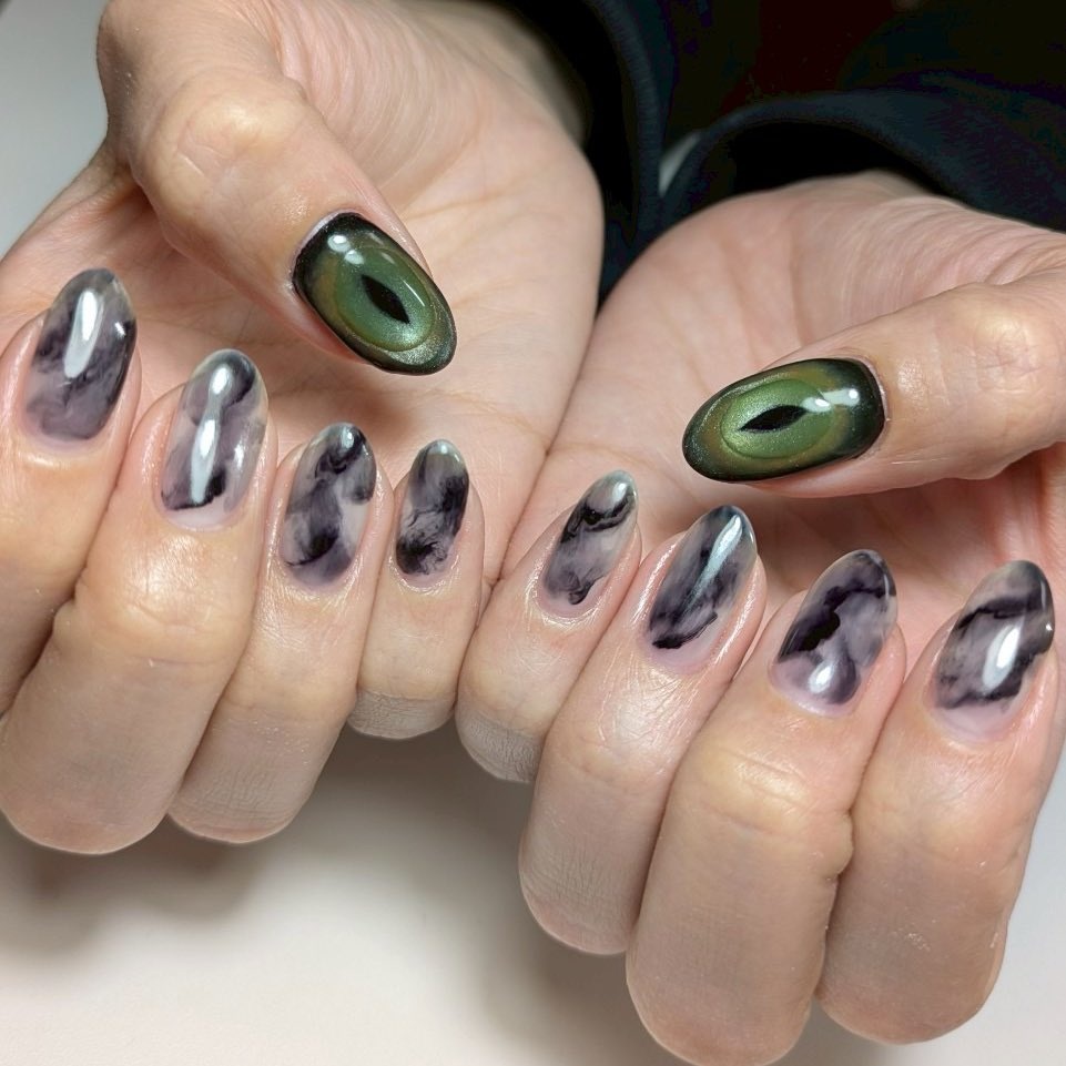 親指のネイルは、深みのあるグリーンカラーに繊細なグラデーションが施され、中央には縦長の円が描かれています。光の入り方や陰影が計算されているのか、立体感を感じさせる仕上がりです。