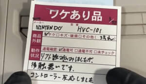 お店の値付けは6380円で、値札には「ワケあり品」の文字。「ソフト読み込みしましたが、接触悪いです。コントローラー反応しました」と添えられています。
