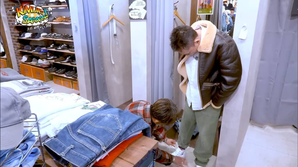 その後、太田さんに似合いそうなボトムスもじっくりと選んでいきます。1本目にカーキのカーゴパンツを選びますが、何気ない会話の中で太田さんが「ジェームズ・ディーンが大好きで」「ジェームズ・ディーンになりたくて、ブルージーンズとかコンバースを」と話したことから、2本目にジェームズ・ディーンが着用していたブランド「Lee」のデニムをチョイス。太田さんに試着を促しました。