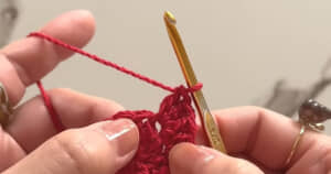 いちごの部分は赤の糸で編んでいきます。左手の人差し指に糸を2回巻き付けて輪を作り、輪の中にかぎ針を通して糸を引っかけて輪から出しました。