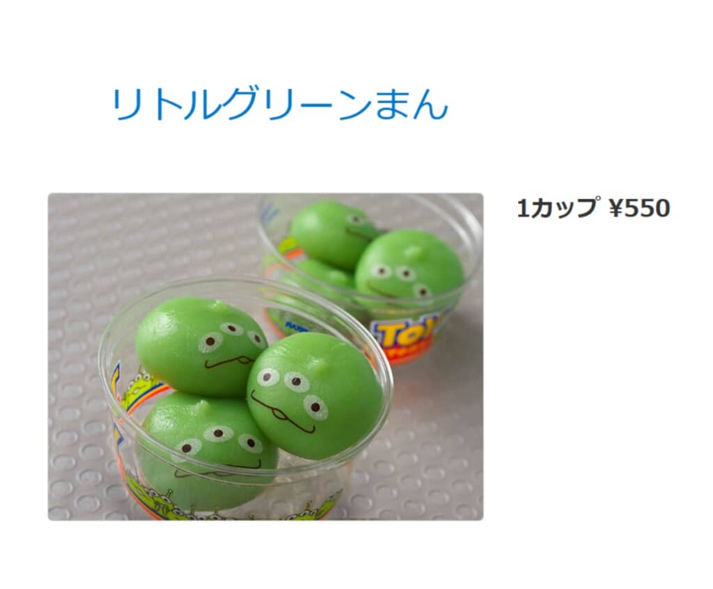 映画『トイ・ストーリー』に登場する「エイリアン(リトルグリーンメン)」の顔を模した3個入りのスイーツメニュー「リトルグリーンまん」も、価格を従来の400円から150円値上げして550円になりました。