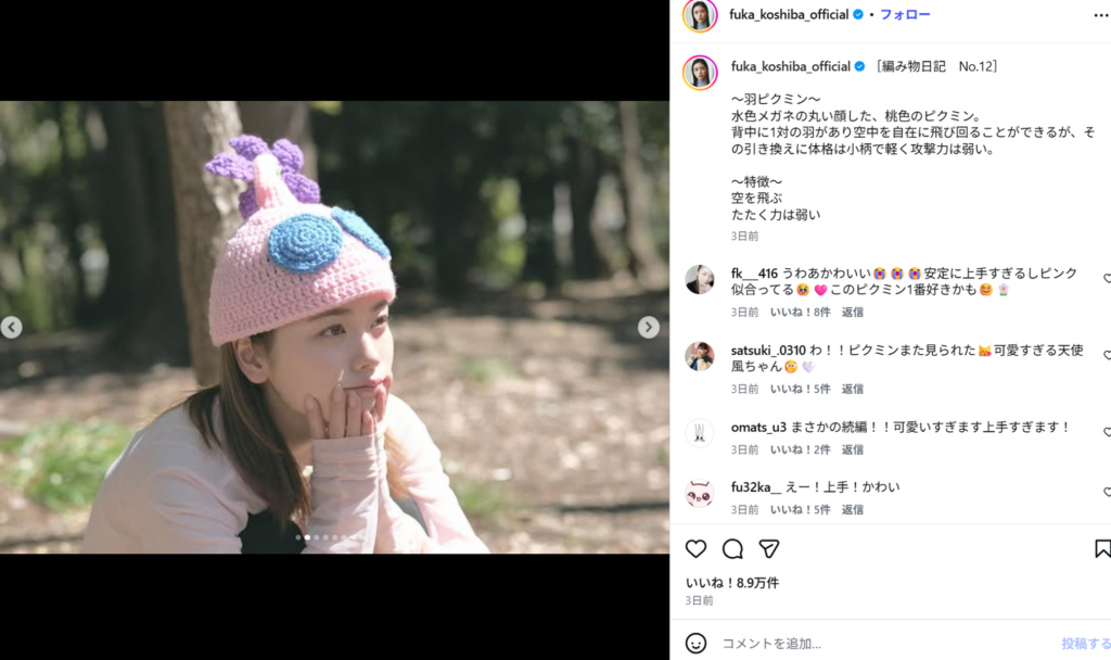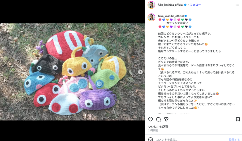 小芝さんは以前からこちらの帽子を複数編んでいるようで「前回のピクミンシリーズがとっても好評で、カレンダーのお渡しイベントでも赤ピクミンや羽ピクミンを編んで被って来てくださるファンの方もいて それがすごく嬉しくて、絶対コンプリートするぞーっと思って作りました」と報告。また続けて「ここだけの話、、ピクミンは大好きだけど、食べられるのが可哀想で、ゲーム自体はあまりプレイしてなくて」「でも今回の4種類を編むのにモチベーションを上げようと思ってピクミン4をプレイしてみたの。そしたらめちゃくちゃハマってしまい、編み始めるのがだいぶ遅くなってしまいました」とゲームにハマったことも明かしています。
