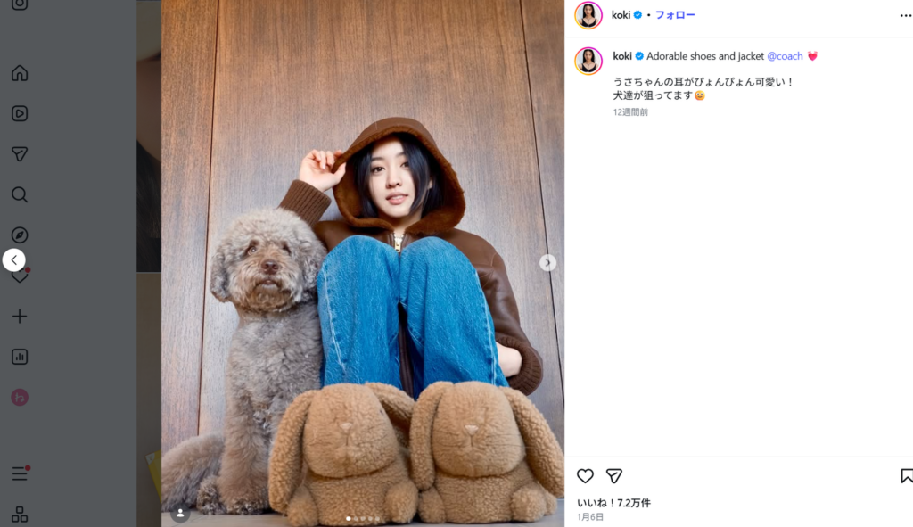Koki,さんは以前から愛犬とのショットを多数公開。愛犬へのかわいらしい愛情表現には思わずほほが緩みます。コメント欄は開放されていないものの、投稿には3.8万件を超える多数の「いいね!」が寄せられていました。