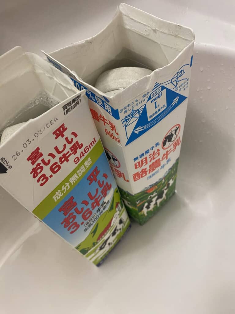 写真には、洗面台と思われる場所に置かれた2本の牛乳パックが写っています。パックは上部が大きく開かれ、中には水が張られています。さらに、その中には上履きがすっぽりと浸されており、見事に簡易的な洗浄容器として再利用されています。なんだこのちょうどいいサイズ感は!