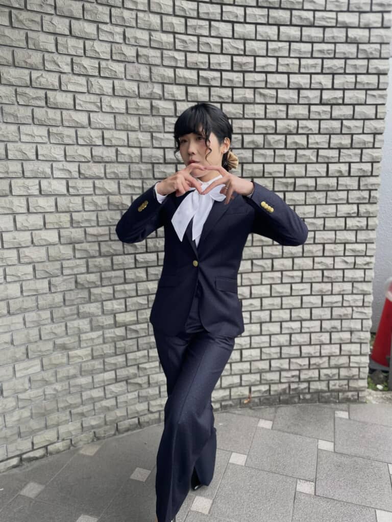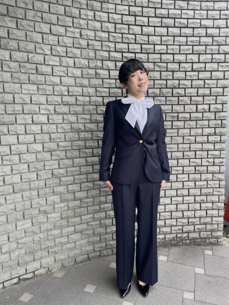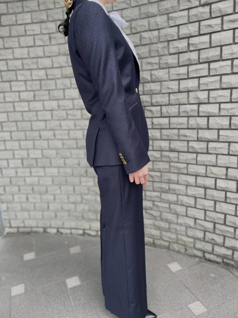 写真には、落ち着いたネイビーのスーツに身を包んだよしこさんの姿が収められています。全体はシンプルながらも、細部にこだわりが詰まった上品なデザインです。