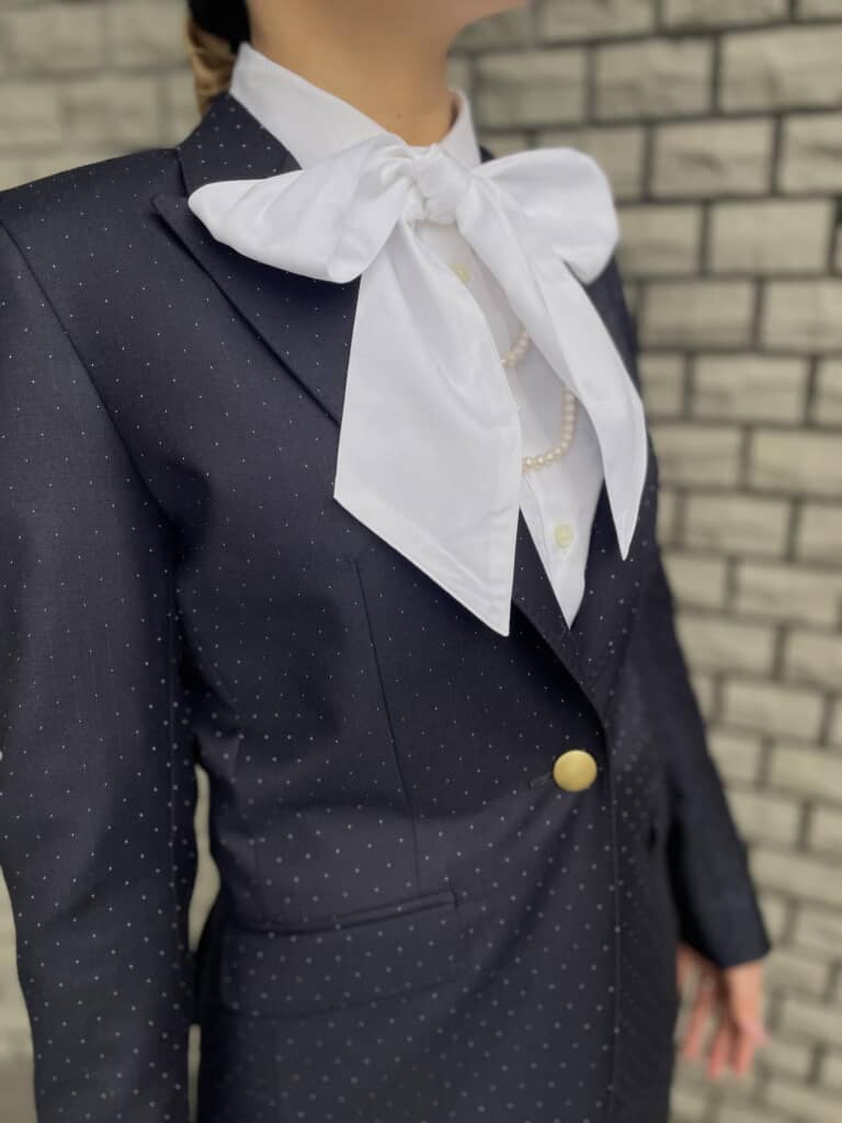 ジャケットは細やかなドット柄が入った生地で仕立てられており、ゴールドのボタンがアクセントになっています。インナーには同じくドット柄の白いブラウスを合わせ、大きなリボンタイが印象的。首元にはパールのネックレスがさりげなくのぞき、フォーマルながら柔らかさも感じられるコーディネートです。