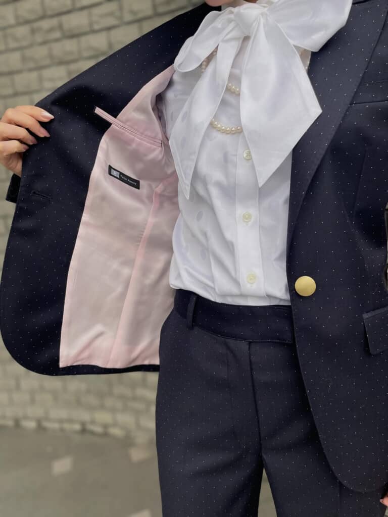 また、ジャケットの裏地は淡いピンクカラーで、見えない部分にも遊び心が感じられます。袖口のボタンやシルエットなど、オーダーメイドならではの美しさが際立っていますね。