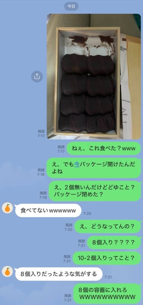 そこで給食ちゃんさんは、LINEで「ねえ、これ食べた?www」と写真を添えて友人に聞いてみます。てっきり渡す前に友人が開けて2つ食べたのだと思っていたのですが、「え、でも今パッケージ開けたんだよね」「え、2個無いんだけどどゆこと? パッケージ閉めた?」と自分でもおかしいことに気づいて、混乱してしまいます。