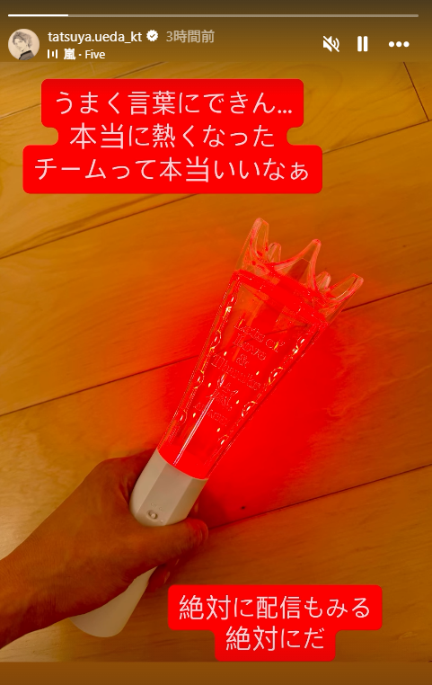上田さんはInstagramストーリーズを更新し、嵐のペンライトを櫻井翔さんのメンバーカラー“赤”にして写真を投稿。「うまく言葉にできん…本当に熱くなった チームって本当にいいなぁ」「絶対に配信もみる絶対にだ」とコメントを添えました。