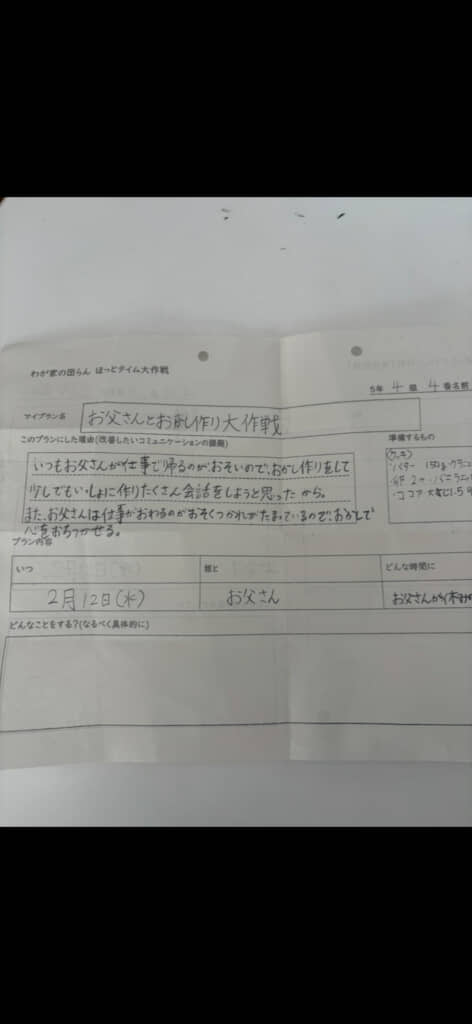 実はこのお誘い、娘さんが考えた「お父さんとおかし作り大作戦」だったようです。プリントには、「いつもお父さんが仕事で帰るのが遅いので、おかし作りをして少しでもいっしょに作りたくさん会話をしようと思ったから。また、お父さんは仕事がおわるのがおそくてつかれがたまっているので、おかしで心をおちつかせる」と作戦内容が詳細に書かれています。これは泣ける……!