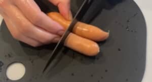 「安定のものだけ入れといたらいいか」と、さっそくお弁当作りを始めた投稿者さん。まずは切り込みを入れたウィンナーや、縦半分に切ったちくわにチーズとベーコンをのせてクルクルと巻いたおかずを準備します。
