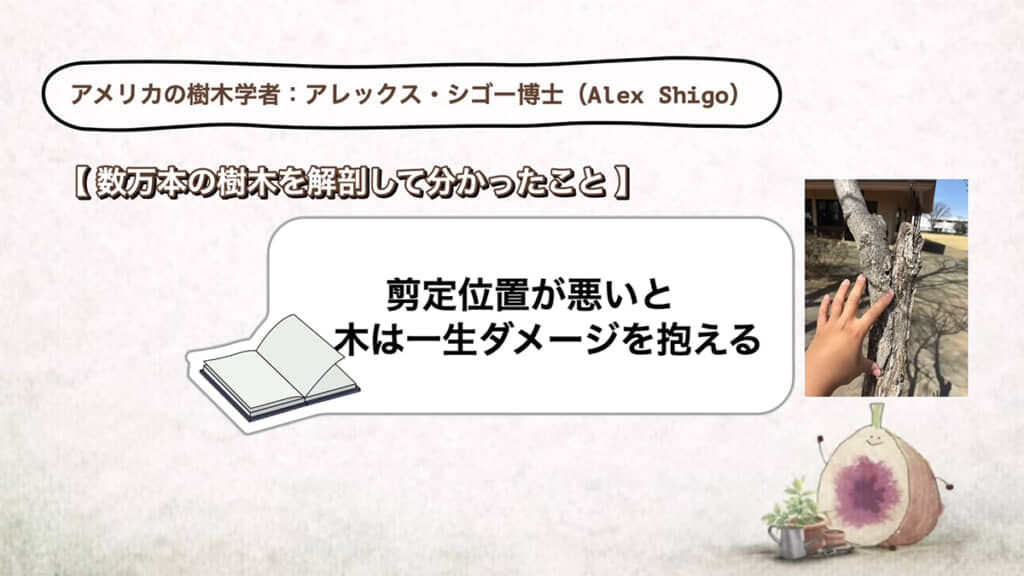 先程NGパターンとして紹介した「幹ギリギリで切る」について考えてみると、これではブランチカラーを削ってしまい、木が持つ防御システムを破壊してしまうことがわかります。