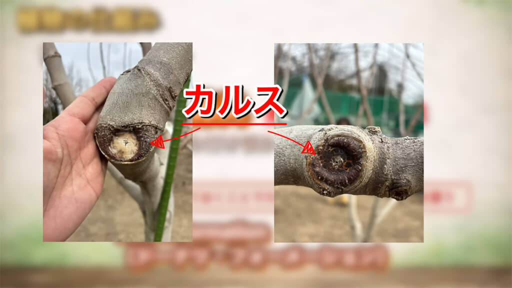 NG剪定とその理由の次は、植物の仕組みを説明します。植物は枝を切るとブランチカラーから、傷を覆う細胞の塊である「カルス」と呼ばれる組織を生み出します。そのためブランチカラーを残しておくと、時間とともにカルスが円を描くように作られていき、傷を覆ってくれるのです。海外ではこの現象を「ドーナツ・フォーメーション」と呼ぶこともあるのだとか。