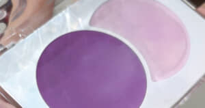 ライラックカラーのチークは、手の上でどぎつい紫に発色! 一般的にイエベさんの肌に青みの強いカラーをのせるとより青さが強調されてしまうものとはいえ、本当にほおに塗ってよいのか心配になる色ですね。ぷりたやさんは、「あのこれ本当にブルベの人に塗ればピンク色に発色するんですか? ド紫なんですが」と半信半疑な様子です。
