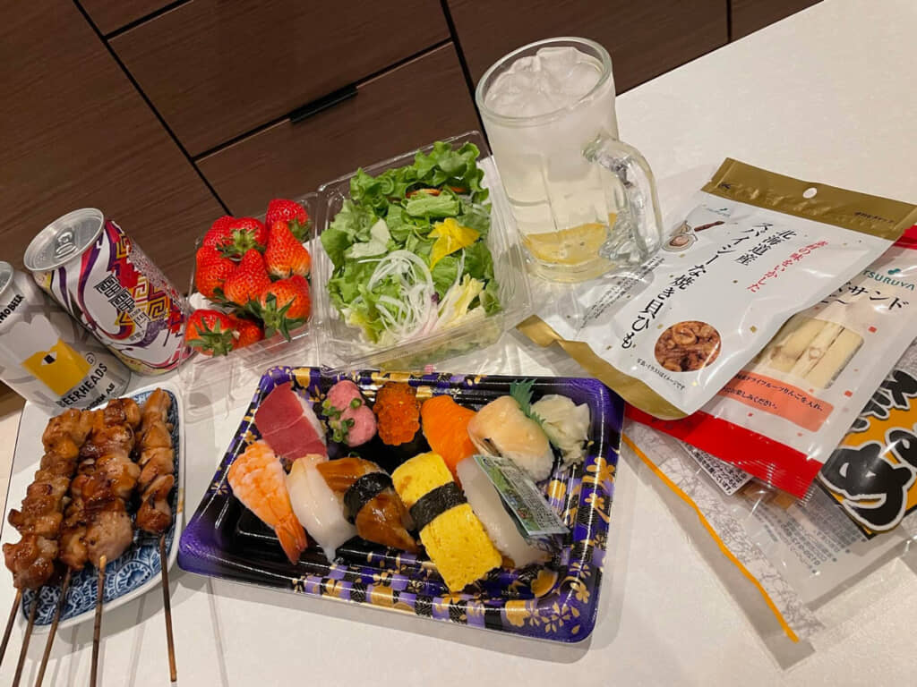 食卓には、寿司や焼き鳥に加え、お酒やおつまみ、デザートにはいちご1パック丸ごと並んでいます。焼き貝ひもやするめといったおつまみの種類も豊富で、テーブルが埋まってしまうほどの豪華さ……!