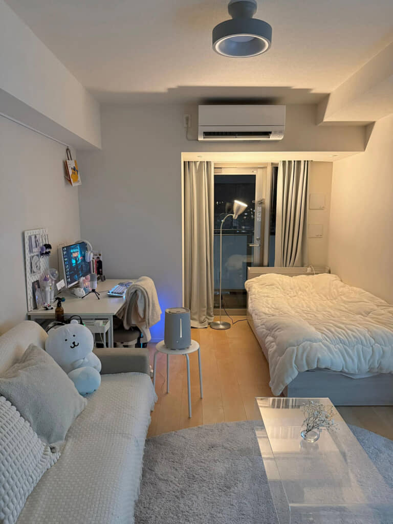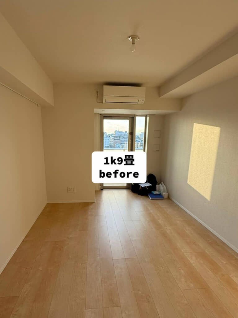 投稿者は、TikTokユーザーのkurage_log(@kurage_log)さん。都内の1K9畳の賃貸で1人暮らしをしており、入居直後と現在を比較して紹介しています。