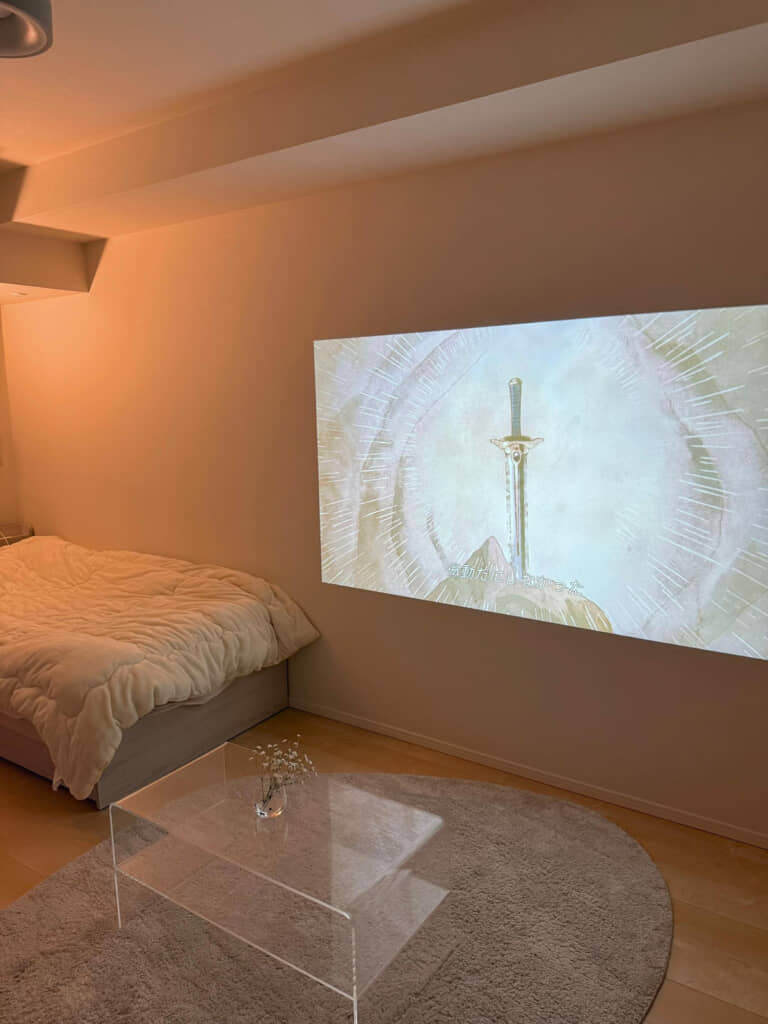 また、部屋にはプロジェクターも設置。ソファの後ろにスタンドを立て、そこから反対側の壁に投影しているようです。ソファにゆったり腰かけて観る映画も楽しそうだ……。