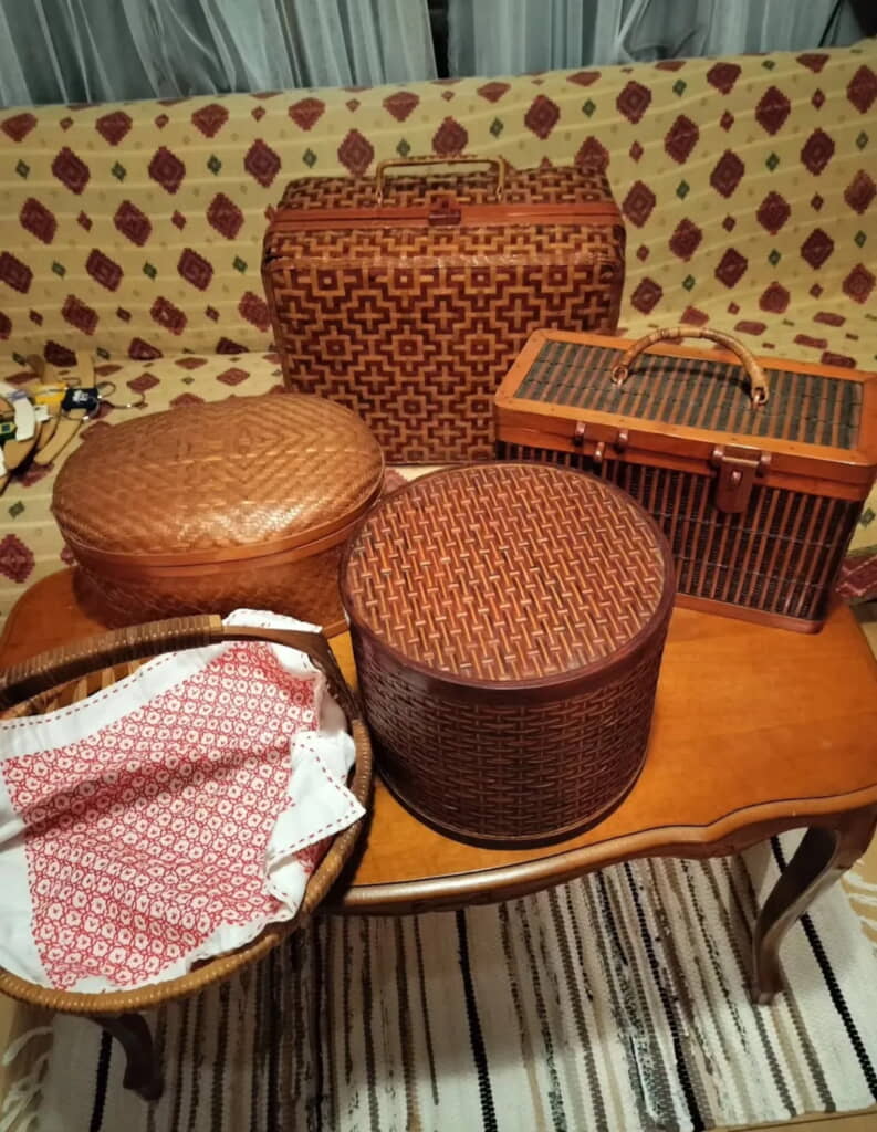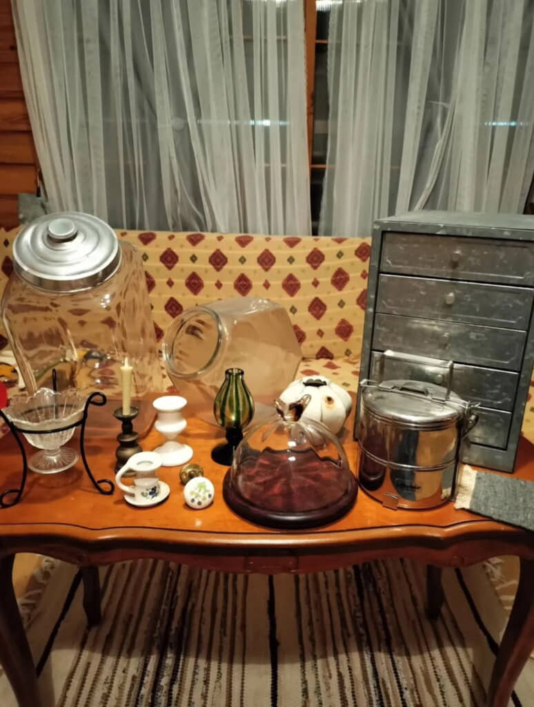 それはアンティークな小物たち。竹細工のカバンや入れ物は大切に使われ、色合いに深みが増していました。金属製の多段引き出しや、大きなガラスの保存瓶、ガラス製のケーキドームや、ランチボックス、キャンドルスタンドなどどれもアルカイックな趣を宿しています。
