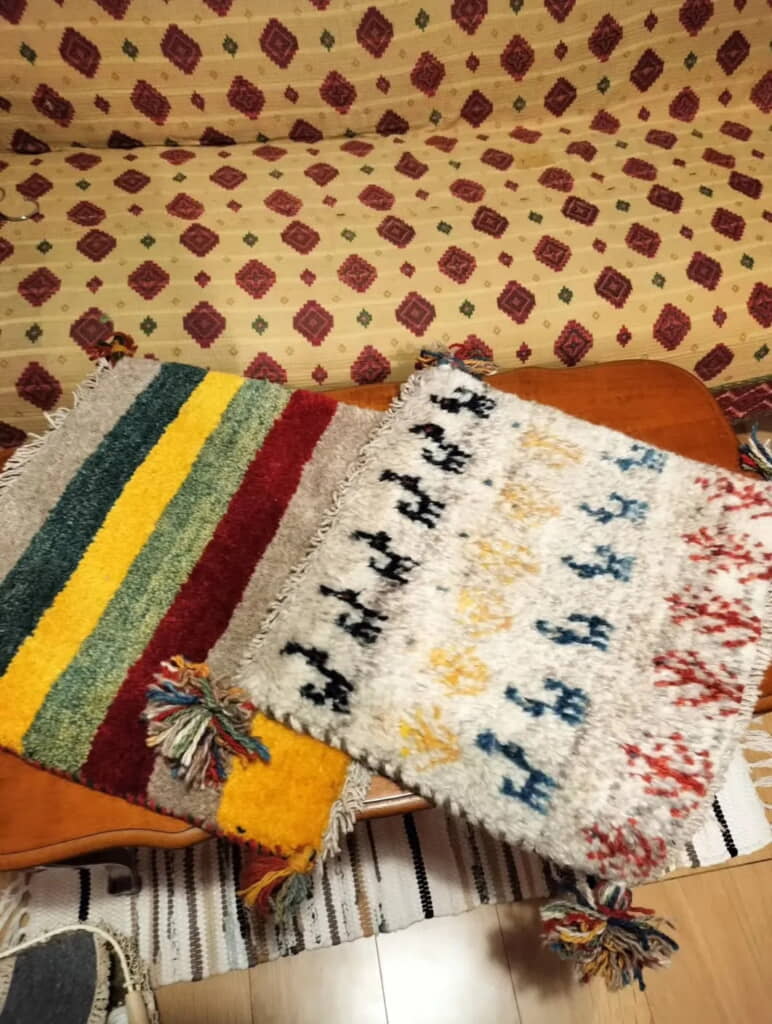 手織りならではのぬくもりのある「ギャッベ」の座布団は、素朴で柔らかな風合いで深い味わいがあります。シンプルなランプも落ち着くデザイン。木製ハンガーは、ミッフィーや動物モチーフが付いていてとっても愛らしいアイテムです。