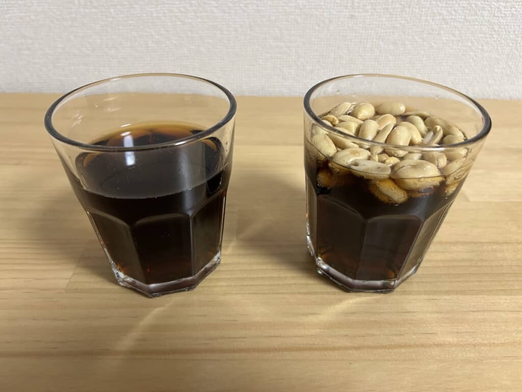 実際にねとらぼの編集部員が試してみたところ、コーラの甘さだけではなくピーナッツの塩分や風味が同時に味わえて、クセになるおいしさでした。また時間をおいてから飲むと、さらに塩分や風味が溶けて「飲むピーナッツバター感」が増しました。ピーナッツの塩分が弱い場合は時間をおいたほうがなお良さそうです。
