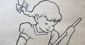 1点目はホウキで床掃除をしている女の子。素朴な絵柄の塗り絵ですが、これがShikiさんの手にかかると、ホウキをギターにみたてヘッドバンギングする女の子になってしまいます。