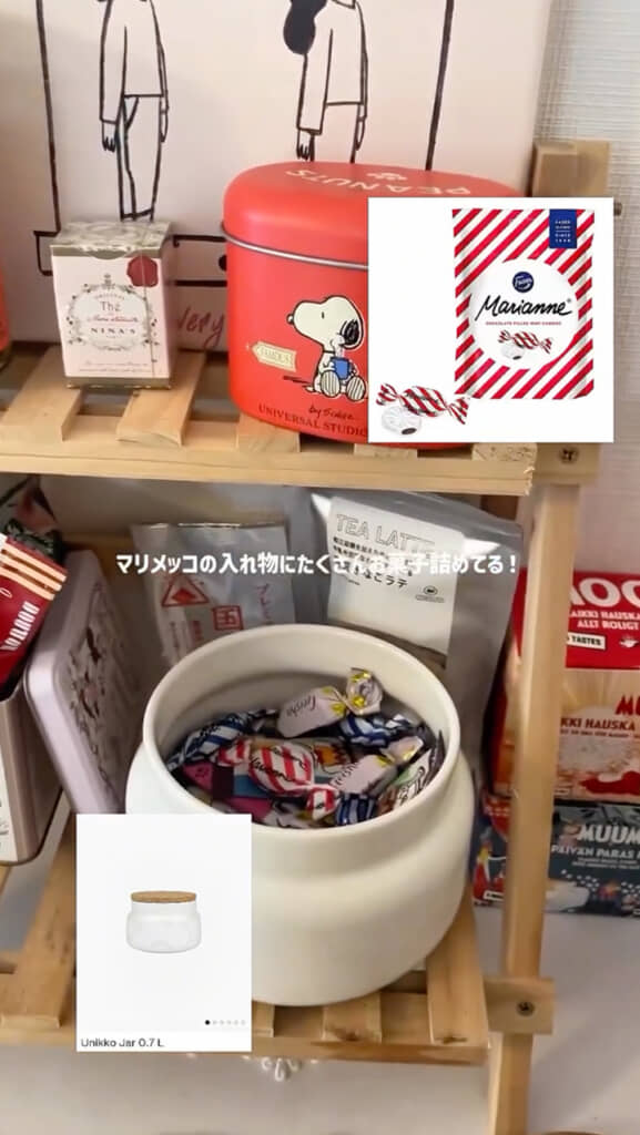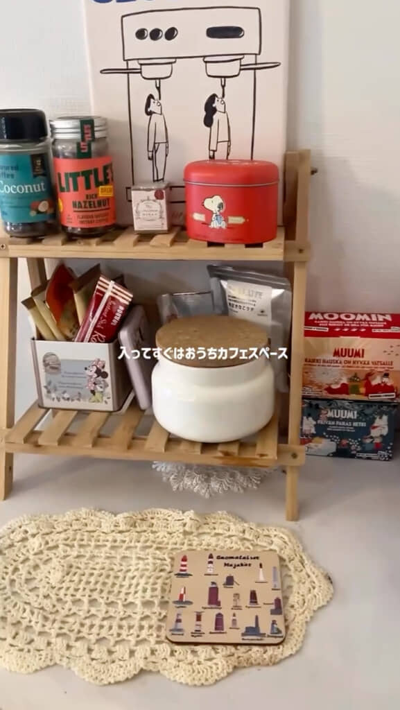 扉を開けてすぐ目に入るのはおうちカフェスペース。チェストの上に小ぶりなウッドラックを設置し、お気に入りの飲み物やお菓子を置いているそうです。マリメッコの入れ物には、大好きな「Marianne」(マリアンネ)のキャンディを詰めているのだとか。