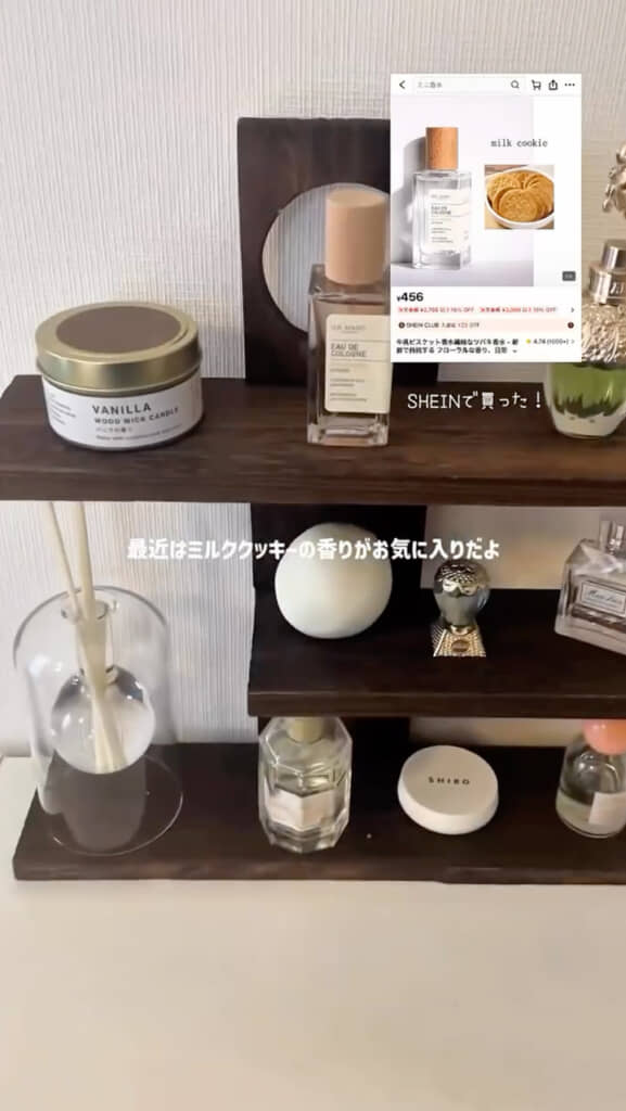 隣には香水や小物をまとめたディスプレイスペースも。最近よく使うのは、通販サイトで購入したミルククッキーの香水だそうです。ほかにもキャンドルやディフューザーなど、香りを楽しめるアイテムが並べられています。