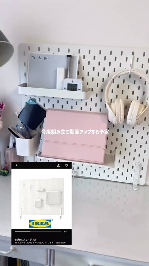 続いてデスク周りを紹介。IKEAの「有孔ボードコンビネーション」を活用して、ヘッドフォンやタブレットを配置。一見ものが少なく見えますが、デスク下にも収納があり、全体をすっきりまとめています。