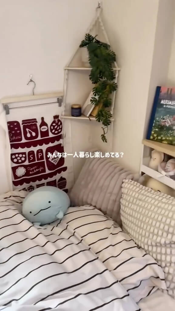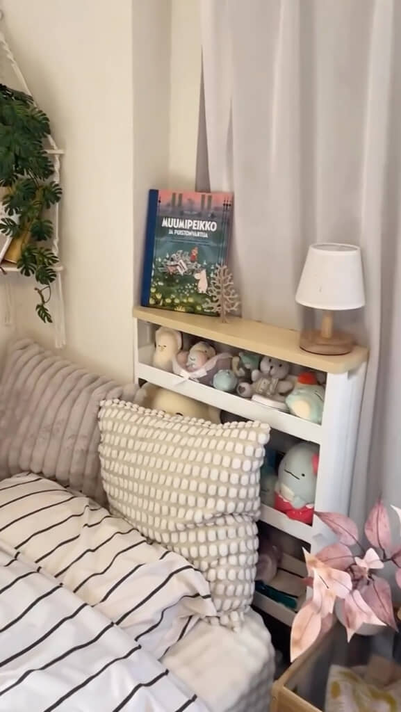 最後に紹介するのはベッド周り。棚にぬいぐるみをまとめ、角にはコーナーハンギングシェルフを設置しています。さらに北欧風のテキスタイルをハンガーで飾り、空間にアクセントをプラス。限られた広さでも、北欧テイストでそろえたかわいらしい空間に仕上がっていますね。
