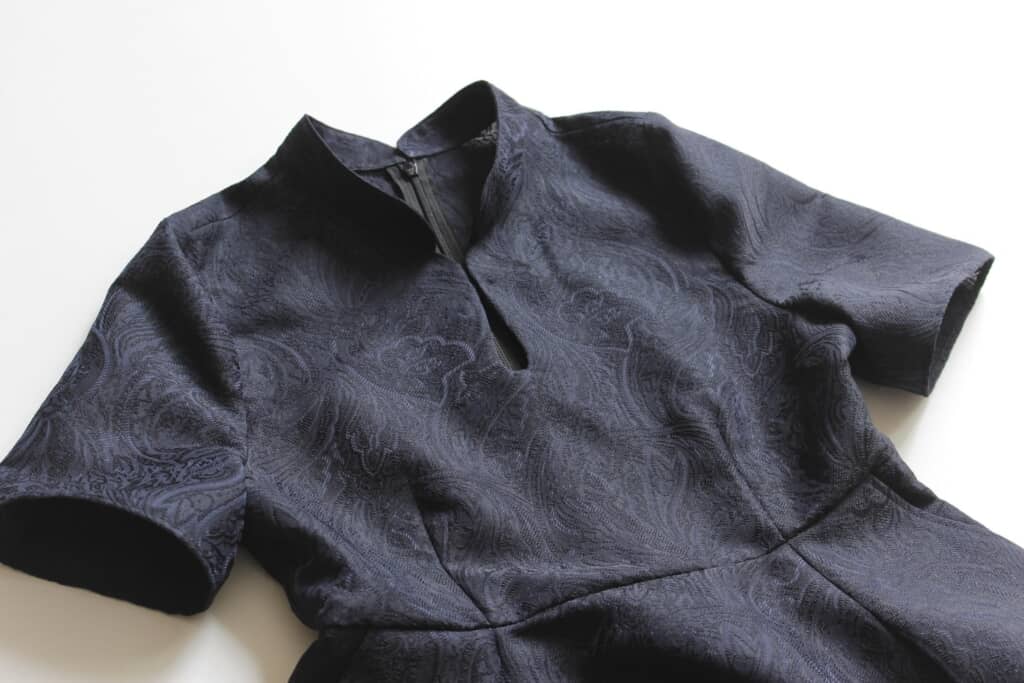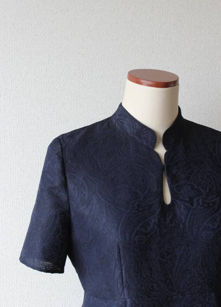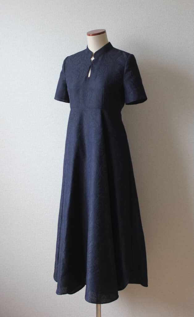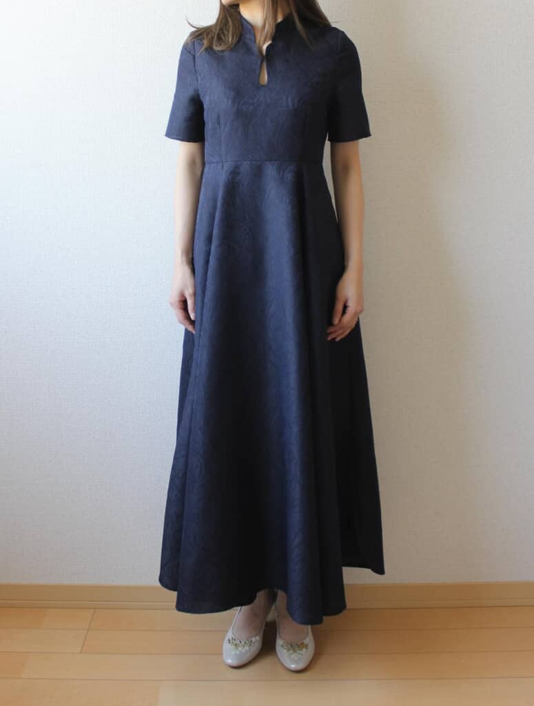 画像を投稿したのはThreadsユーザーの「makusa」(@ma_ku_sa)さん。投稿されたワンピースは、深みのあるネイビーカラーが印象的なフォーマルなデザインです。