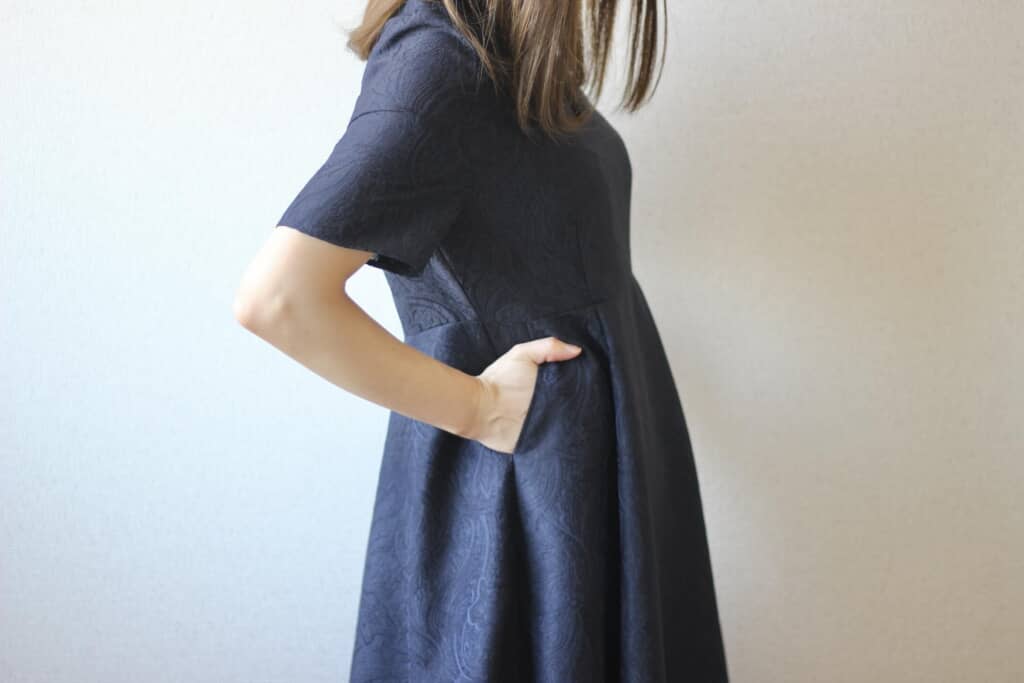 さらに注目すべきは、実用性にもしっかりと配慮されている点です。腰部分にポケットが設けられており、フォーマルウエアでありながら日常的な使いやすさも意識されています。見た目の美しさだけでなく、「着る人のことを考えた設計」であることが伝わってきますね。