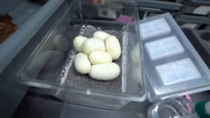 今年の1クラッチ目だという7個の卵は別の容器に入れ、温度と湿度が管理されたインキュベータールームへと移動。この部屋で管理すると卵は50~55日でふ化し、ヘビの赤ちゃんが生まれてきます。