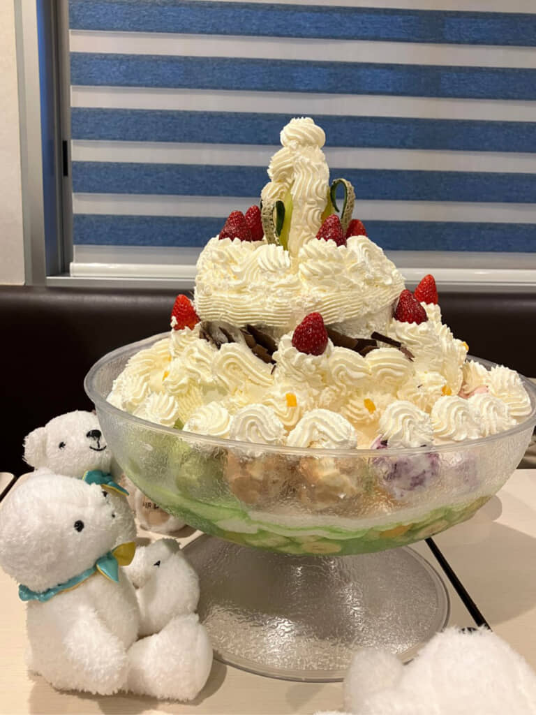 ドリームジャンボパフェは、その名のとおり夢の中から飛び出てきたような見た目の巨大パフェ。寒天やフルーツの土台の上に、イチゴやケーキ、アイスクリームなどが豪快に乗っており、大量のクリームでデコレーションされています。そのお値段なんと1万6300円!