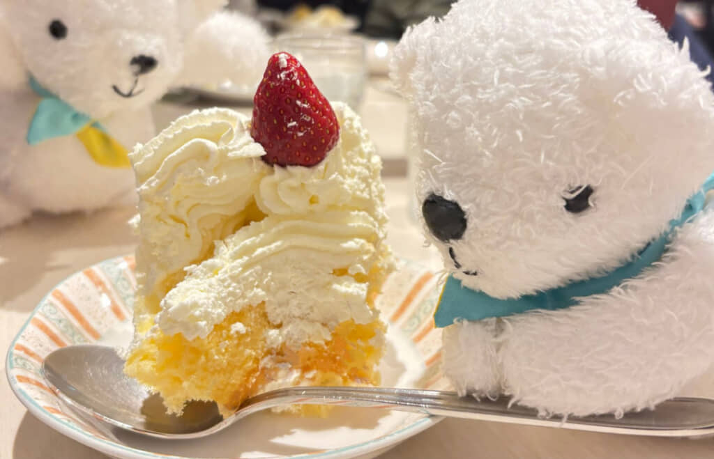 今回、ベア・ドゥたちは、北海道札幌市にある「雪印パーラー」の名物「ドリームジャンボパフェ」を食べるようです。大きな器に盛られたパフェを待ちきれない様子で見つめています。