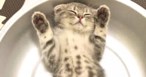 ビフォー写真では、ひんやり気持ちいいアルミ製の猫鍋に入って、あお向け&バンザイの姿勢でスヤスヤと眠る、生後約2カ月のまんぼうくんの姿が。そのあまりにもかわいすぎる“ヘソ天”に思わずニヤけてしまいます。