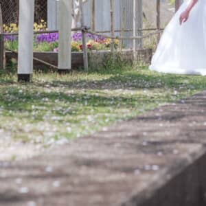 今回の投稿では、岡山県の天瀬駅跡で桜をバックに撮影したウエディングフォトを公開。休憩所として活用されているレトロかわいい駅舎が有名なスポットで、2人はウエディングドレス&スーツ姿で電車を出迎えるようなおそろいのポーズで写っています。