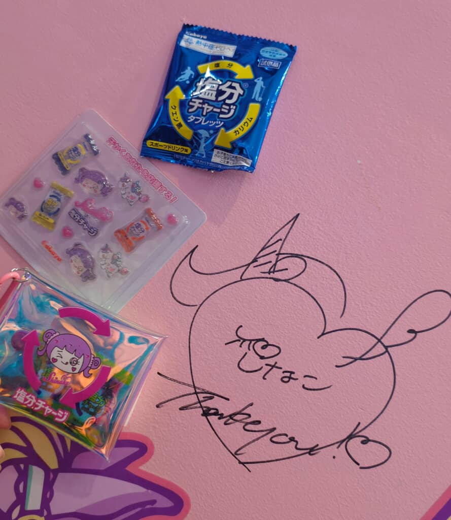 こうした取り組みを受け、塩分のタブレットを販売するカバヤ食品は一定期間、同店に商品を提供。店頭ではしなこさんが、自身のイラストをあしらったポーチや立体シールに加え、塩分補給用タブレットの配布も行いました。