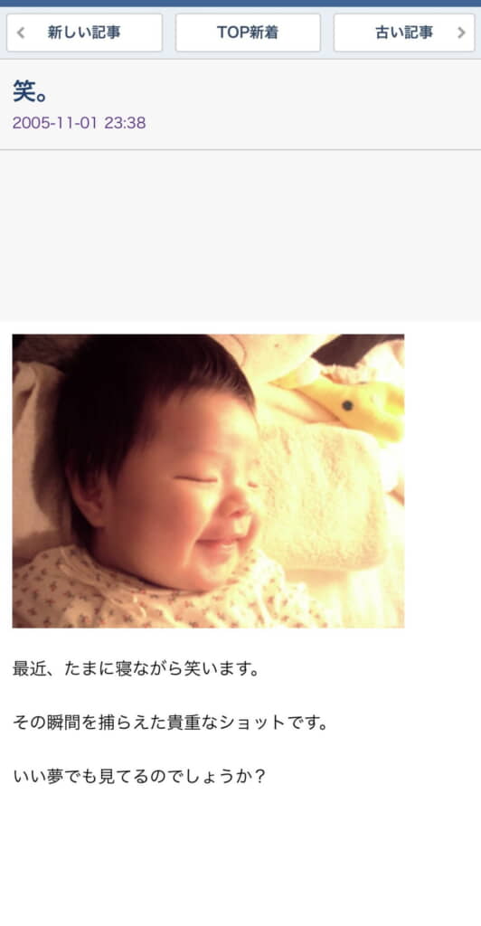 それは20年前の時間がそのまま封じられていました。Neneさんが生まれるまでの日々の記録や、誕生後の小さな出来事まで、言葉少なく丁寧にブログへと書き留めていたお父さん。生後2カ月ごろに寝ながら笑っているようなNeneさんの写真、少し大きくなって「“ヨーダ”と同じくらいになりました。」と我が子の成長を喜ぶ記事。