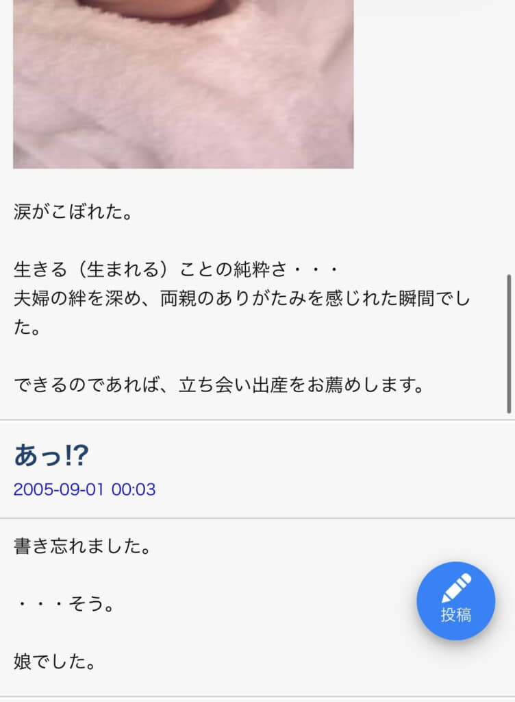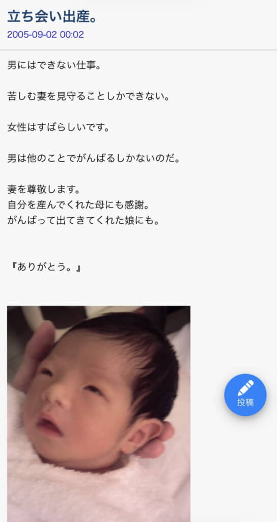 そしてついにその日がやってきました。「立ち会い出産。」というタイトルのその記事には、見守ることしかできない自分への葛藤と、「男は他のことでがんばるしかないのだ。」という静かな決意が刻まれています。そしてたった一言『ありがとう。』という言葉が……。