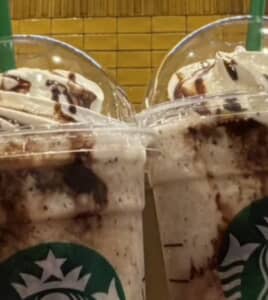 フラペチーノを注文したふたりは、スターバックスの文字を背景に手を掲げて撮影しようとしました。しかしその瞬間、にゅっと飛び入り参加してきた存在が……。