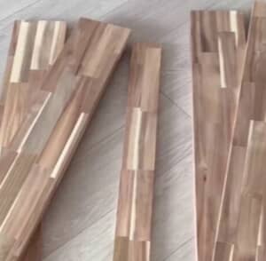 どうせならと、自分の好きな空間を構築することに。高さが101センチで横は86.5センチ、奥行きは13センチのスペースにアカシア材で2段の棚を作っていきます。