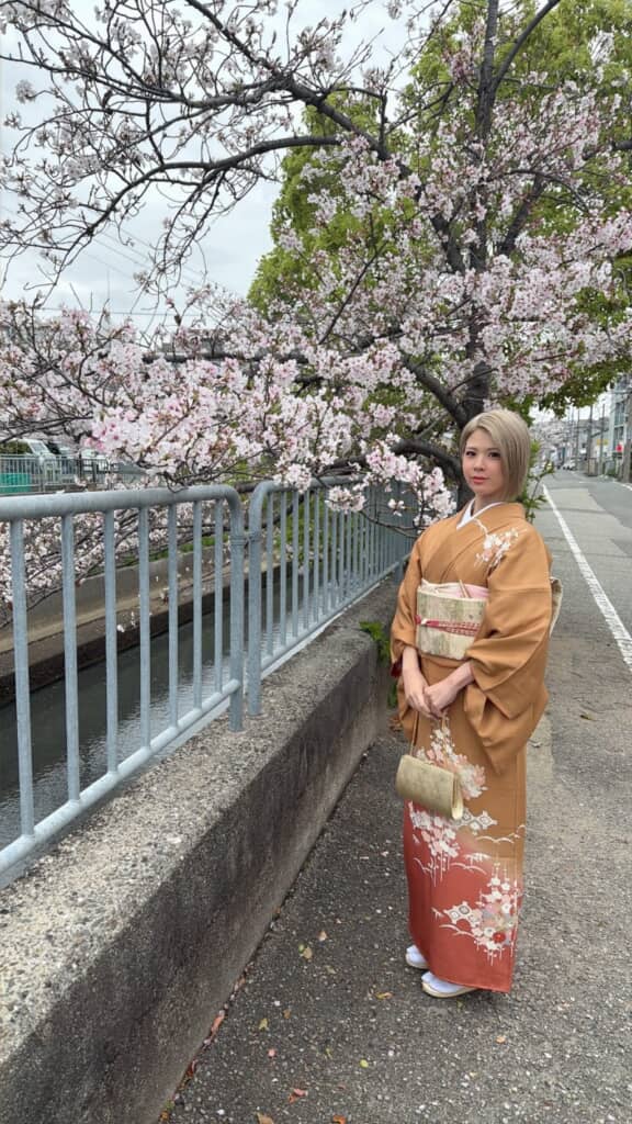 YOHさんが着ているのは薄いブラウンの着物。花模様の裾はレンガ色でグラデーションがとってもきれいです。帯は淡い緑で帯揚げは薄いピンクという春らしい組み合わせ。落ち着いた金の髪色と背景の桜も相まって、シックな印象です。
