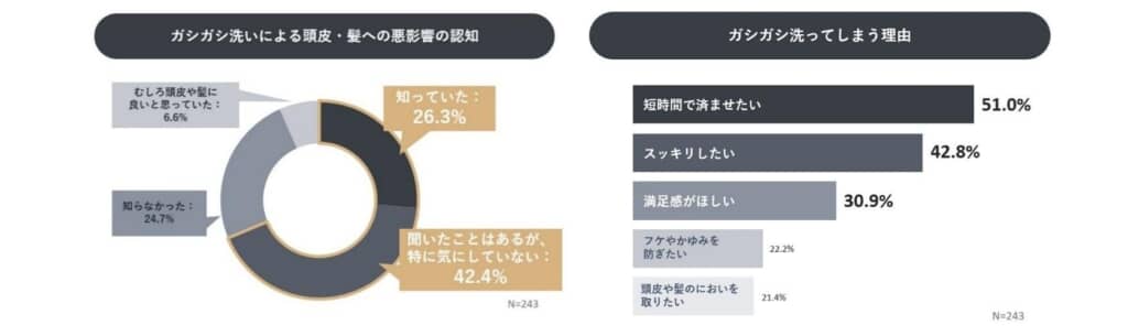 unoの調査によれば、髪や頭皮を力強く洗ってしまう“ガシガシ洗い”をしている男性は4人に1人。一方で、“ガシガシ洗い”が髪や頭皮に悪影響を及ぼしかねないと認識している人は26.3%、「聞いたことはあるが、特に気にしていない」という人を含めると、頭皮や髪に良くないと理解している人は68.7%になりますが、「(洗髪を)短時間で済ませたい」「スッキリしたい」などの理由から“ガシガシ洗い”をしてしまっている現状が浮き彫りになりました。