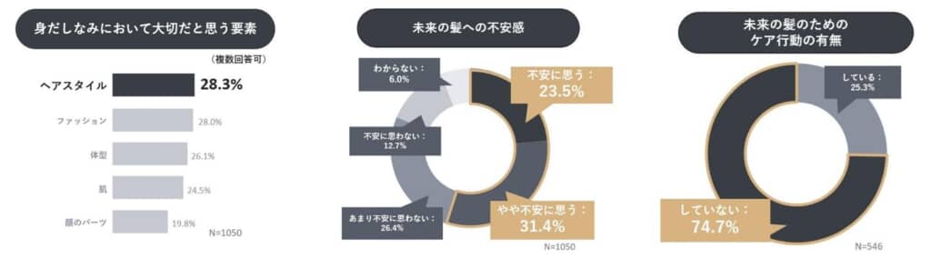 思う:23.5%、やや不安に思う:31.4%)。しかし、具体的なヘアケアに取り組んでいる人はわずか25.3%と、大きなギャップがあることも明らかになりました。