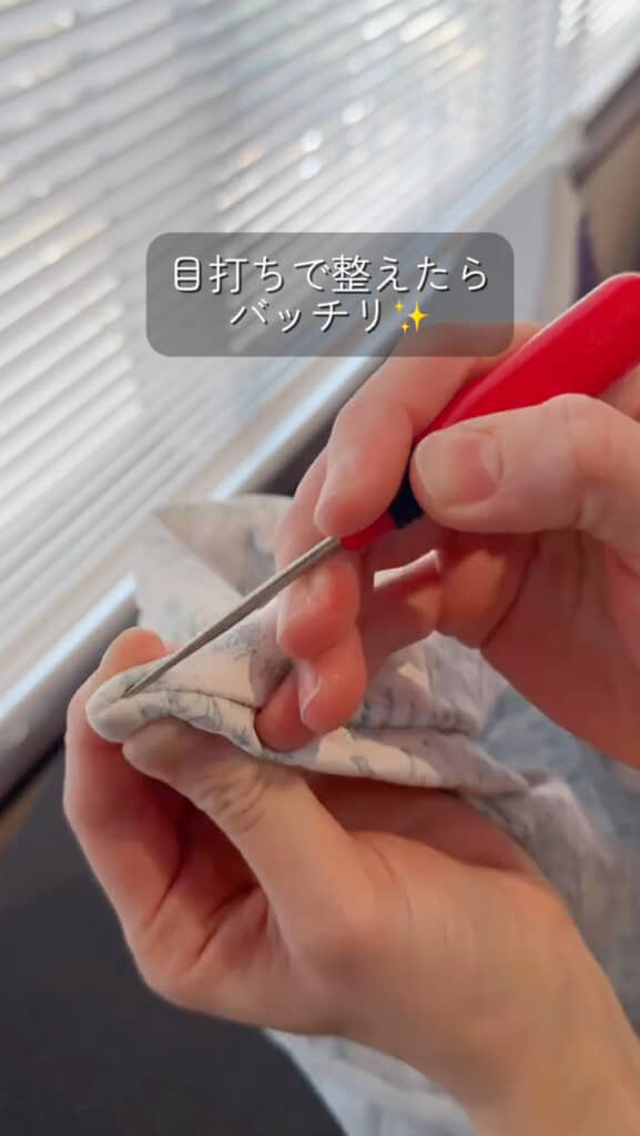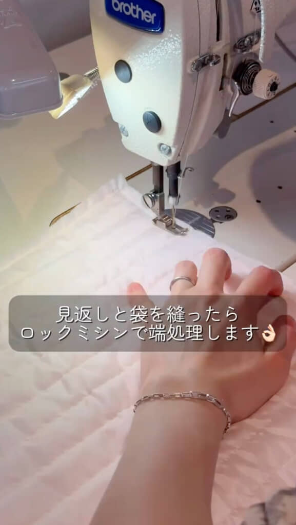 パーツがそろったら本体と見返しをミシンで縫い合わせ、端をロックミシンで処理。アイロンで縫いしろを押さえ、本体を表に返して角を目打ちで整えます。このひと手間で、仕上がりがぐっときれいになるそうです。
