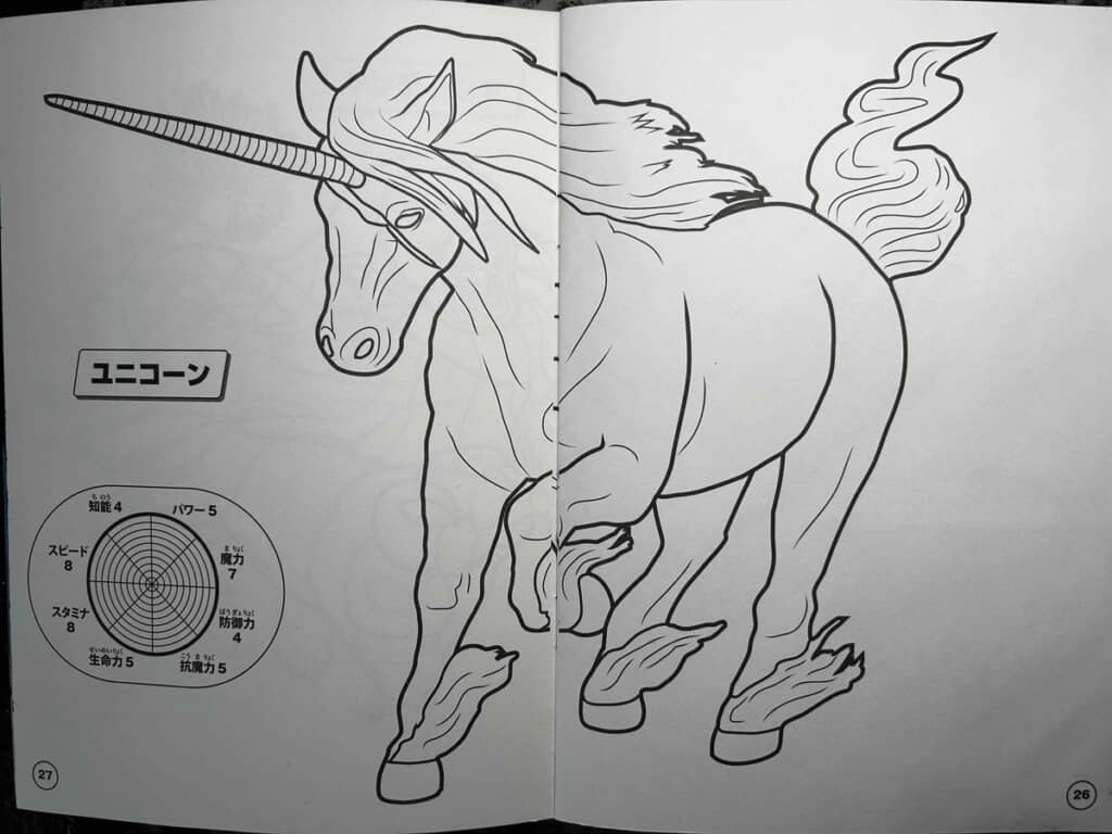 できあがった作品を見ると……なんということでしょう! ユニコーンには墨で力強く陰影が描かれ、まるでそこに存在しているかのよう。さらには飛び散るような、かすれたような筆跡で、すさまじい躍動感を表現しています。よくよく見ると、「パワー」や「スピード」などのパラメーターにもちゃんと墨が塗られていますね。100均の塗り絵でここまでできるものなのか……!
