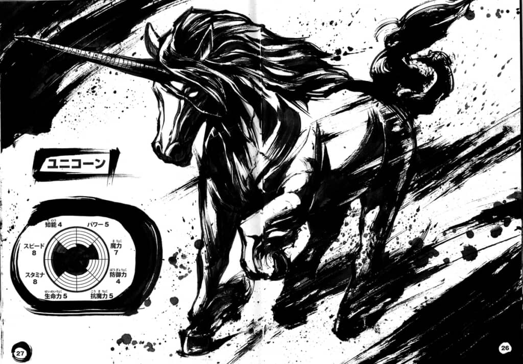 ユニコーンは、額に1本の角が生えた、馬のような造形をした幻獣です。イラストでは左前脚を蹴り上げるような仕草で、なにか敵と戦っているのか、はたまたどこかに走り去ろうとしているかに見えます。